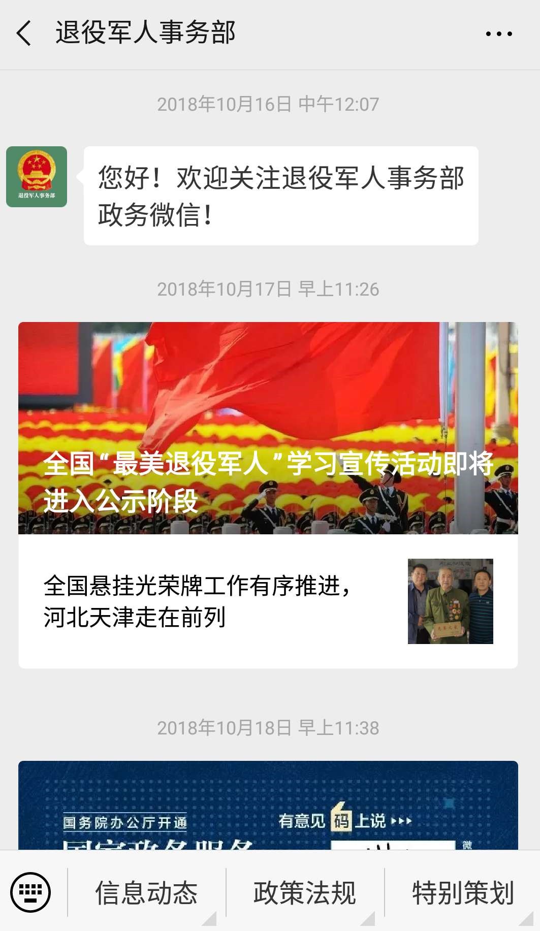開通并運營好部官方網站和官方微信公眾號,積極提供"互聯網+退役軍人服務",提升公眾查詢政府信息便捷度。部官方網站于2018年7月31日開通,開設"機構"、"新聞"、"公開"、"服務"、"解讀"、"互動"、"風采"等欄目,以及"信息采集和光榮牌懸掛專欄"、"'最美退役軍人'學習宣傳活動專欄"等專題板塊,充分發揮官方網站作為政府信息公開"第一平臺"的作用。網站開通部長信箱,接受社會公眾意見建議,與網友積極互動,及時回應關切。官方微信公眾號于2018年10月16日開通,開設"信息動態"、"政策法規"、"特別策劃"欄目,創新展現形式,做好信息發布。
