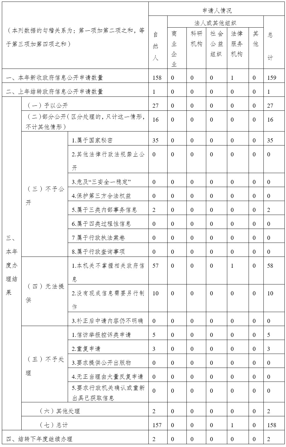 注:本年度新收91件申請(含159個申請事項),上年度結轉1件申請(含1個申請事項)。鑒于對同件申請的各申請事項可能存在不同答復情形,本表格在統計時按照申請事項計數。