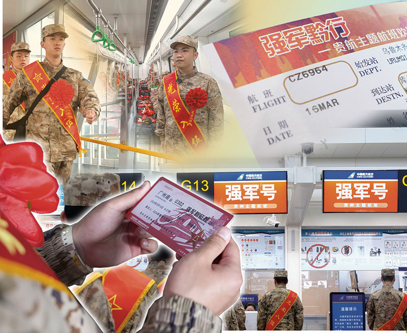 3月羊城,廣州南站站臺上,“強軍號”高鐵新兵運輸專線列車迎面駛來。新兵劉國旭攥著印有“強軍新征程”字樣的紀念車票,和新戰友一同登車。幾乎與此同時,千里之外的貴陽龍洞堡國際機場,“強軍號”空中新兵運輸專線同步啟動。數百名新兵在主題值機柜臺前優先辦理登機手續,快速通過綠色安檢通道,踏上為國戍邊的征程。陸地與天空,兩條專線,串聯起家鄉與軍營,開啟了新兵軍旅生涯的序幕。