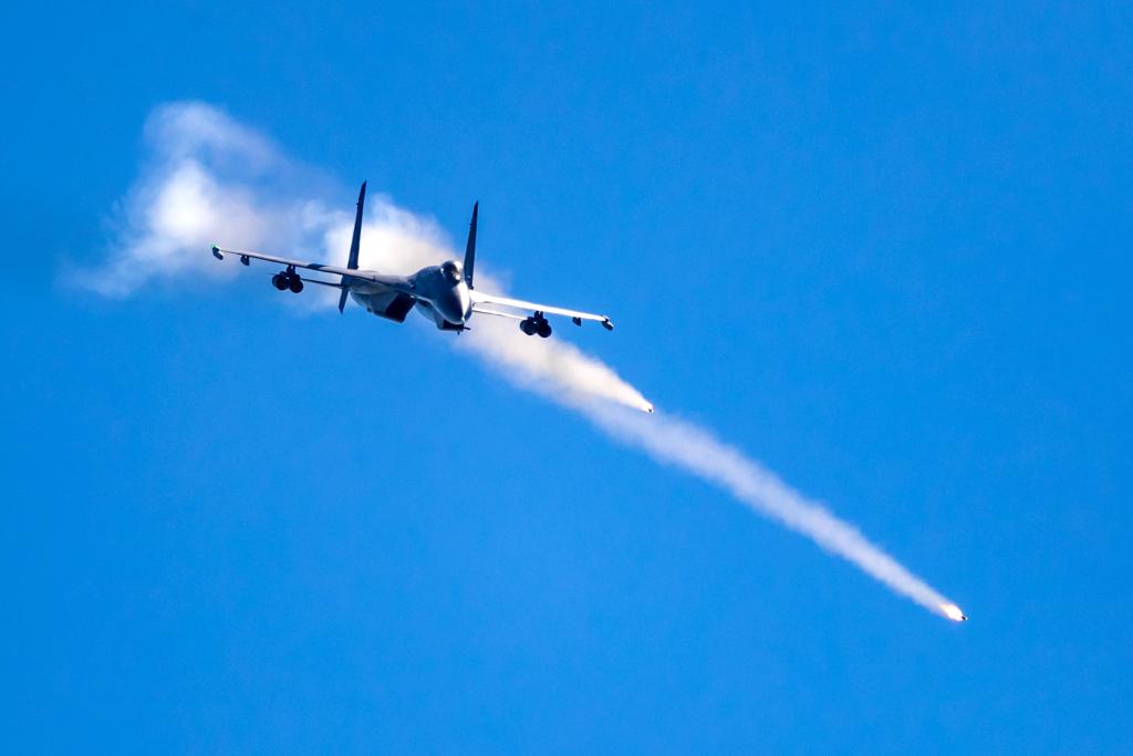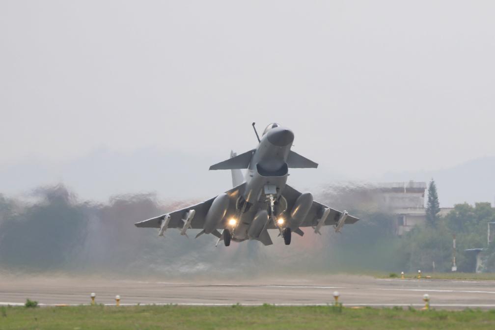 2023年4月8日,東部戰區圓滿完成環臺島戰備警巡和“聯合利劍”演習。這是殲擊機掛彈起飛。新華社發(王紫簫 攝)