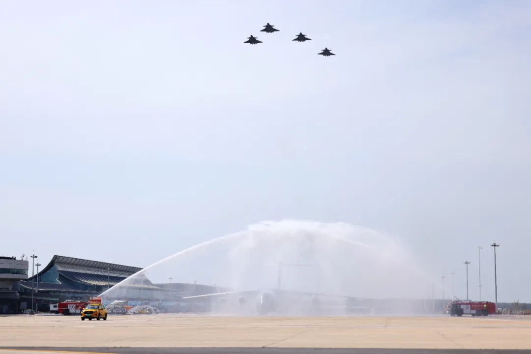10時57分,空軍運–20專機緩緩降落在遼寧沈陽桃仙國際機場。專機進入中國領空后,空軍4架殲–20戰(zhàn)斗機護航,并在機場上空通場,“雙20”同框向志愿軍烈士致以崇高敬意,桃仙國際機場以“過水門”航空最高禮儀迎接志愿軍烈士遺骸回家。