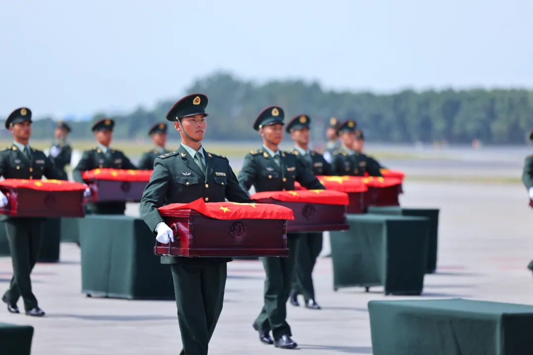 儀式現場莊嚴肅穆,志愿軍烈士遺骸棺槨覆蓋著鮮艷的五星紅旗,到場迎接的解放軍官兵軍容威嚴、持槍鵠立,現場全體人員向烈士遺骸行三鞠躬禮,以此表達對先烈們的深切緬懷和無盡哀思。