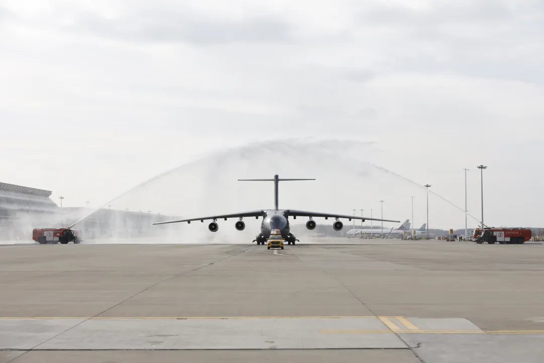 11月28日上午,空軍專機運-20降落在遼寧沈陽桃仙國際機場。沈陽桃仙機場以“過水門”航空最高禮儀迎接志愿軍烈士遺骸回家。陳建辰?攝