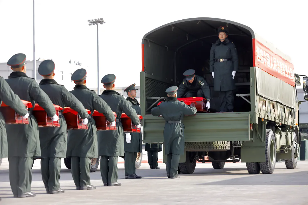 11月28日上午,43位志愿軍烈士英靈及495件遺物由我空軍專機從韓國接回并護送至遼寧沈陽。來源:新華社