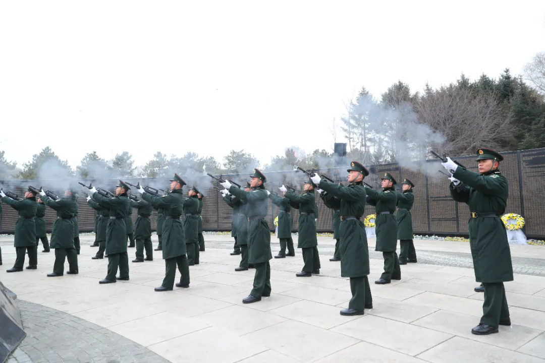 陵園的下沉式紀念廣場周圍蒼松肅立、翠柏含悲。環(huán)形的烈士英名墻下擺滿了黃白相間的菊花,祖國和人民不會忘記先烈的功勛。參加儀式的人們肅穆站立,緬懷先烈,銘記歷史。上午10時,軍樂隊奏響婉轉(zhuǎn)低回的《思念曲》,在解放軍儀仗司禮大隊戰(zhàn)士持槍護衛(wèi)下,禮兵護送志愿軍烈士遺骸棺槨緩步進入紀念廣場,全場奏唱中華人民共和國國歌。裴金佳致祭文后,全體人員向烈士三鞠躬,27名禮兵連續(xù)鳴槍12響,向志愿軍烈士致以崇高敬意。