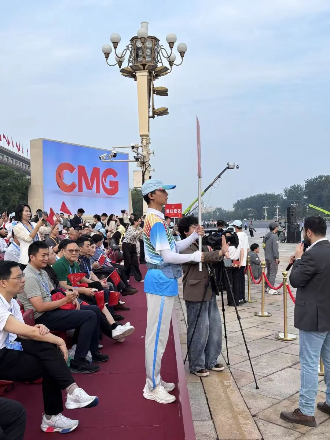 胡金超在閱兵現場舉牌引導觀禮嘉賓