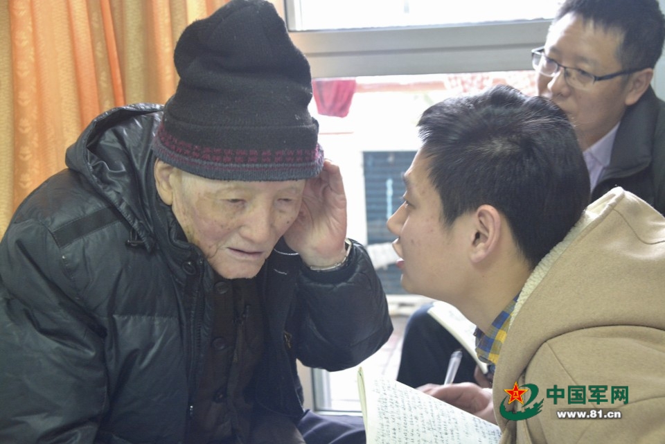 在浙江省寧波市,工作人員聽抗戰老兵鮑子文講述戰斗故事。莫 非攝
